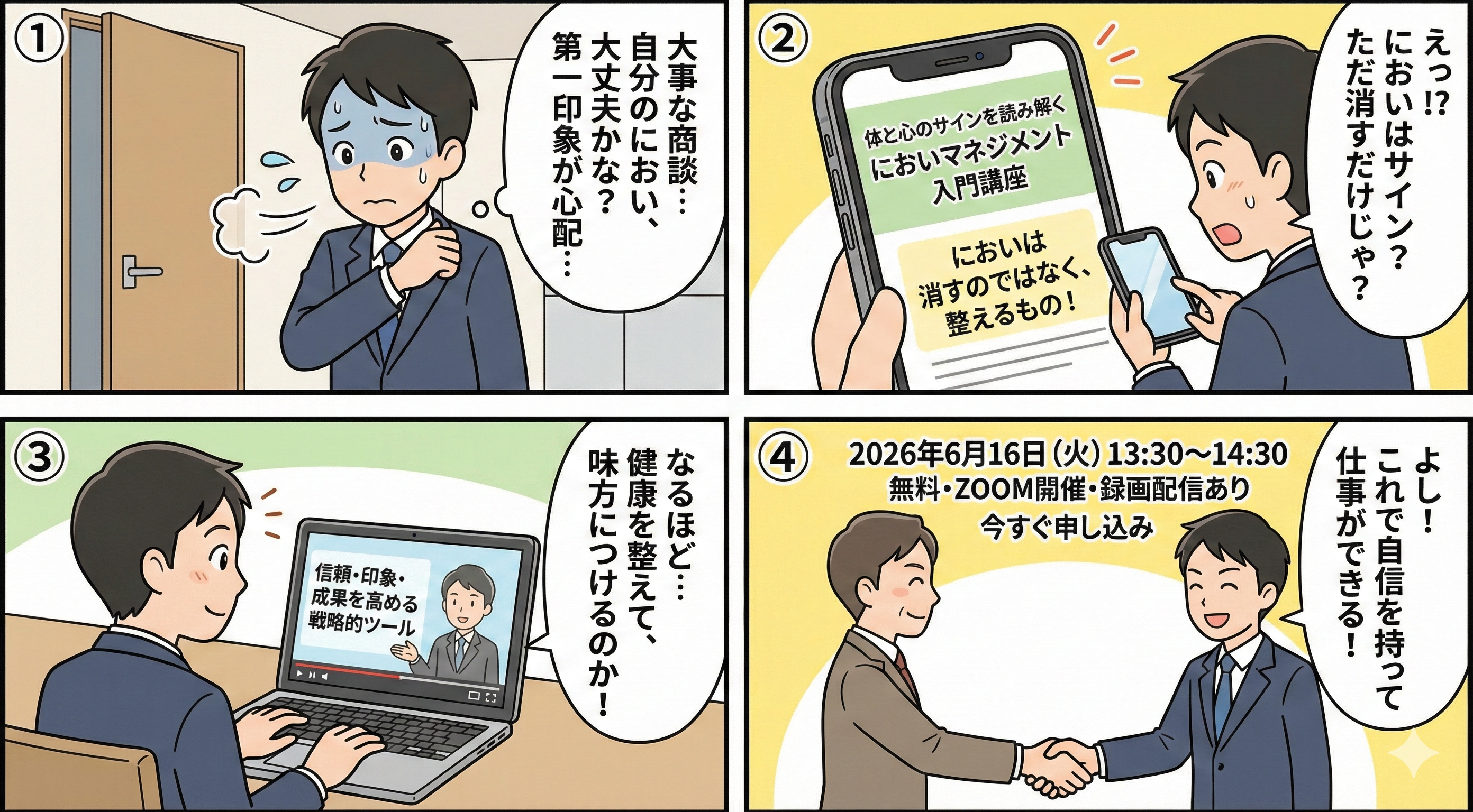 成果が変わる「においマネジメント」入門講座は、経営者・管理職・リーダー層や人前に立つ仕事の方向けのセミナーです。においを消すのではなく、読み取り整える視点を学び、信頼や第一印象、仕事の成果につなげる実践的な考え方を身につけます。