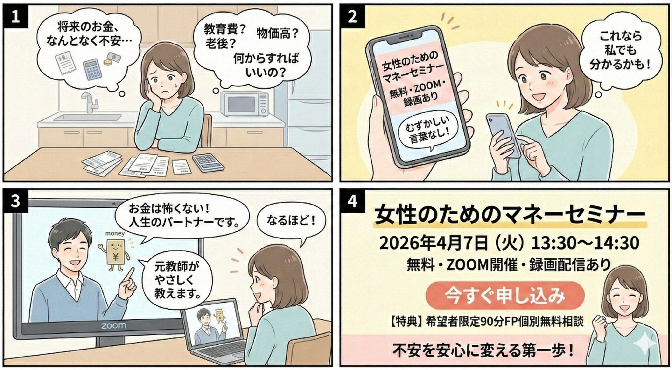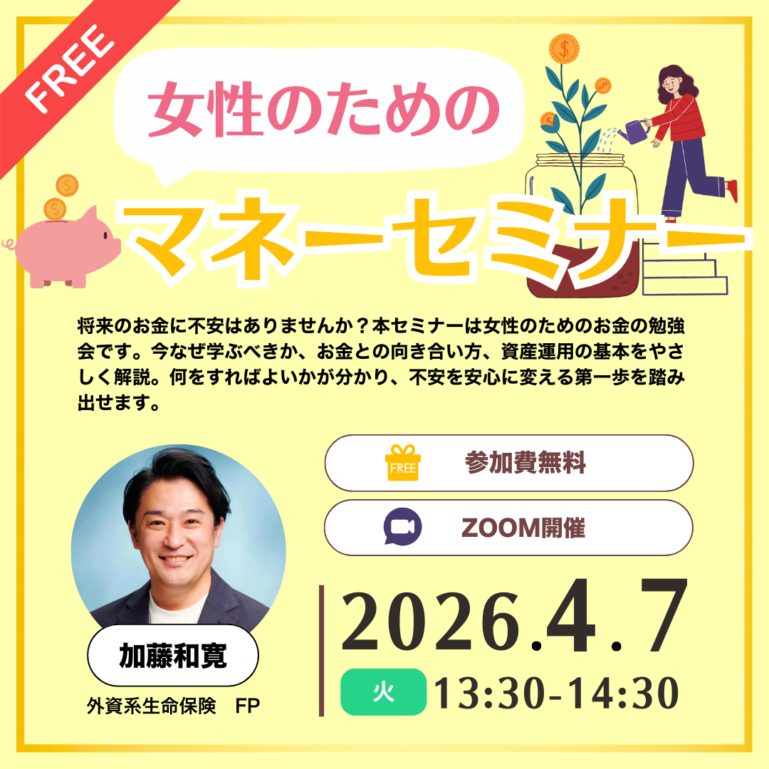 将来のお金に不安はありませんか?本セミナーは女性のためのお金の勉強会です。今なぜ学ぶべきか、お金との向き合い方、資産運用の基本をやさしく解説。何をすればよいかが分かり、不安を安心に変える第一歩を踏み出せます。