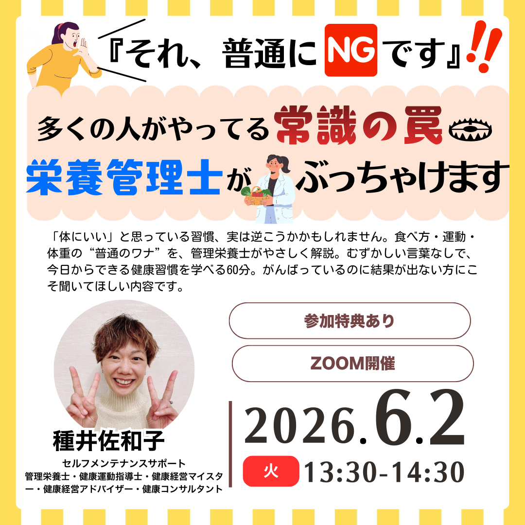 「体にいい」と思って続けていること、実は逆こうかかもしれません。食べ方・運動・体重の考え方には、多くの人が知らずにハマっている“普通のワナ”があります。このセミナーでは、管理栄養士が健康とダイエットの本当のところをわかりやすく解説。むずかしい専門用語は使いません。今日からすぐにできる健康習慣を、楽しく学べる60分です。がんばっているのに結果が出ない方にこそ、聞いてほしい内容です。