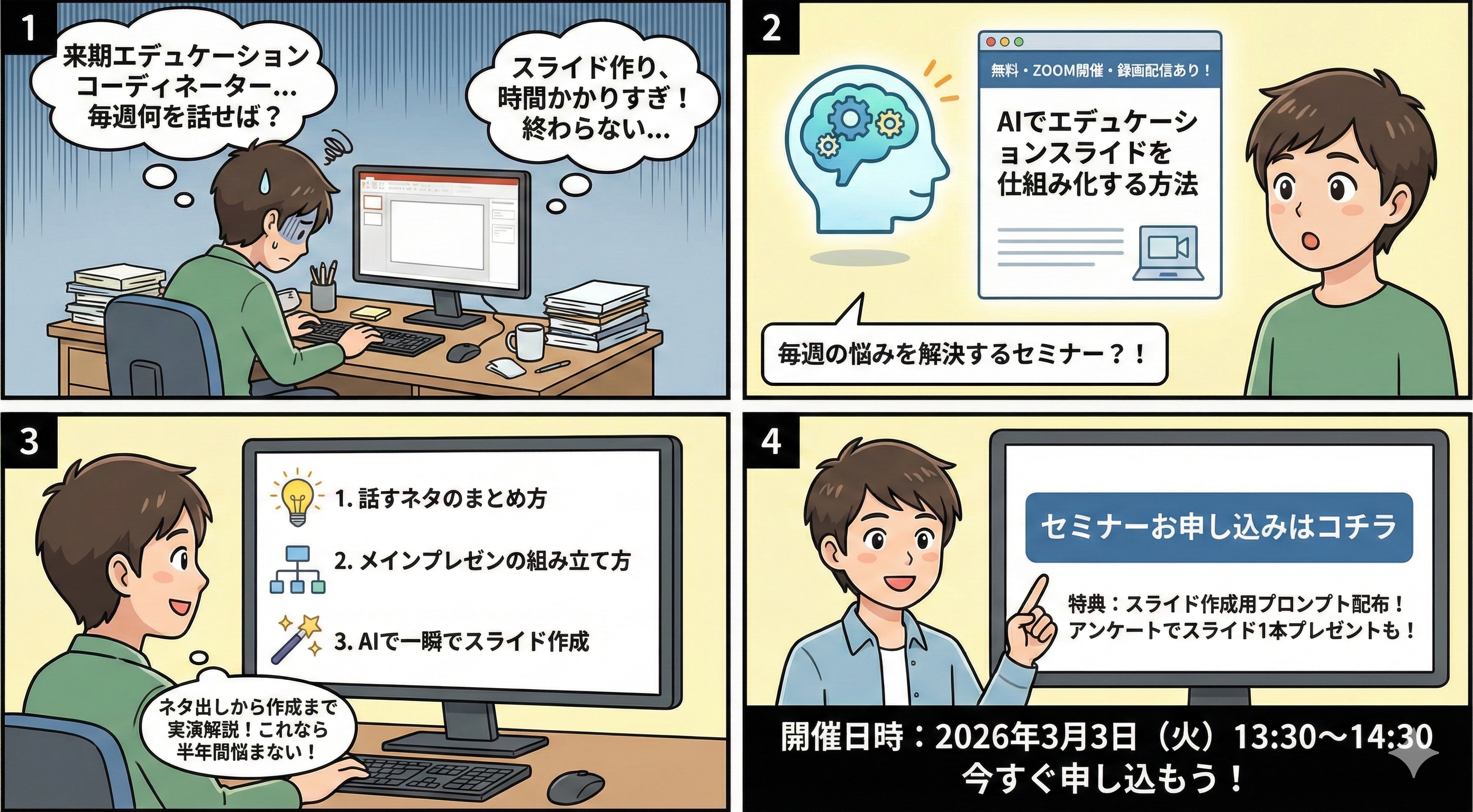 毎週のエデュケーションで「何を話せばいいか分からない」「スライド作りに時間がかかる」と感じていませんか?本セミナーでは、AIを使ってエデュケーションスライドを仕組み化する方法を分かりやすくお伝えします。