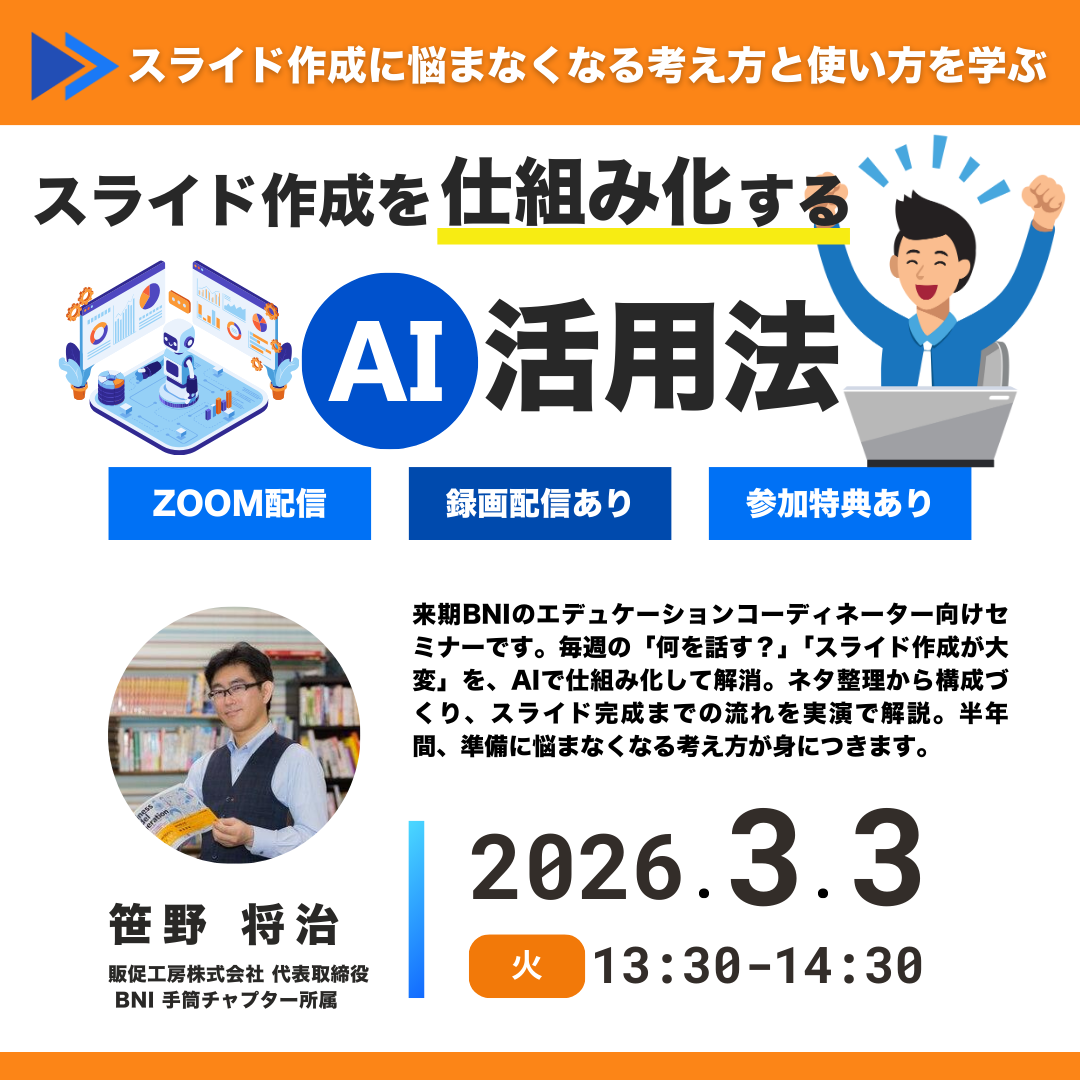 来期BNIのエデュケーションコーディネーター向けセミナーです。毎週の「何を話す?」「スライド作成が大変」を、AIで仕組み化して解消。ネタ整理から構成づくり、スライド完成までの流れを実演で解説。半年間、準備に悩まなくなる考え方が身につきます。