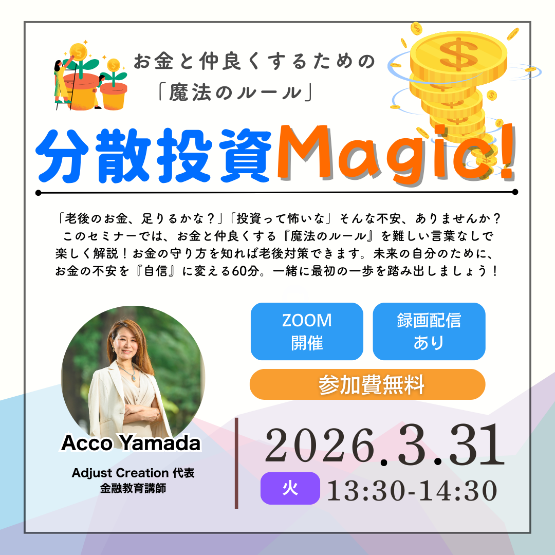 「老後のお金、足りるかな?」「投資って怖いな」そんな不安、ありませんか?このセミナーでは、お金と仲良くするための「魔法のルール」をお教えします。