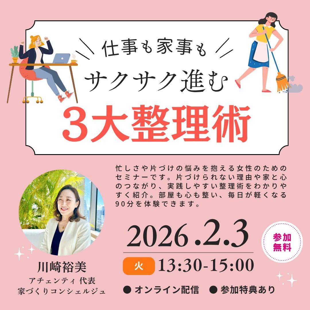 仕事も家事もサクサク進む3大整理術 は、「毎日が忙しくて片づけまで手が回らない」「頑張っているのにうまくいかない…」という女性のためのセミナーです。