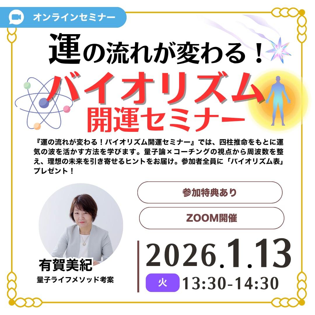 『運の流れが変わる!バイオリズム開運セミナー』では、四柱推命をもとに運気の波を活かす方法を学びます。量子論×コーチングの視点から周波数を整え、理想の未来を引き寄せるヒントをお届け。参加者全員に「バイオリズム表」プレゼント!