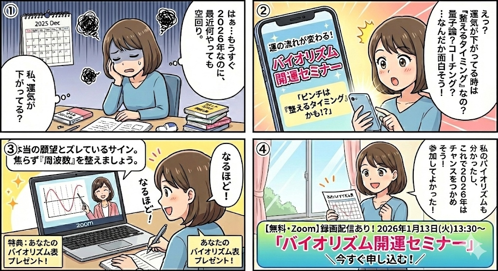 『運の流れが変わる!バイオリズム開運セミナー』では、四柱推命をもとに運気の波を活かす方法を学びます。量子論×コーチングの視点から周波数を整え、理想の未来を引き寄せるヒントをお届け。参加者全員に「バイオリズム表」プレゼント!