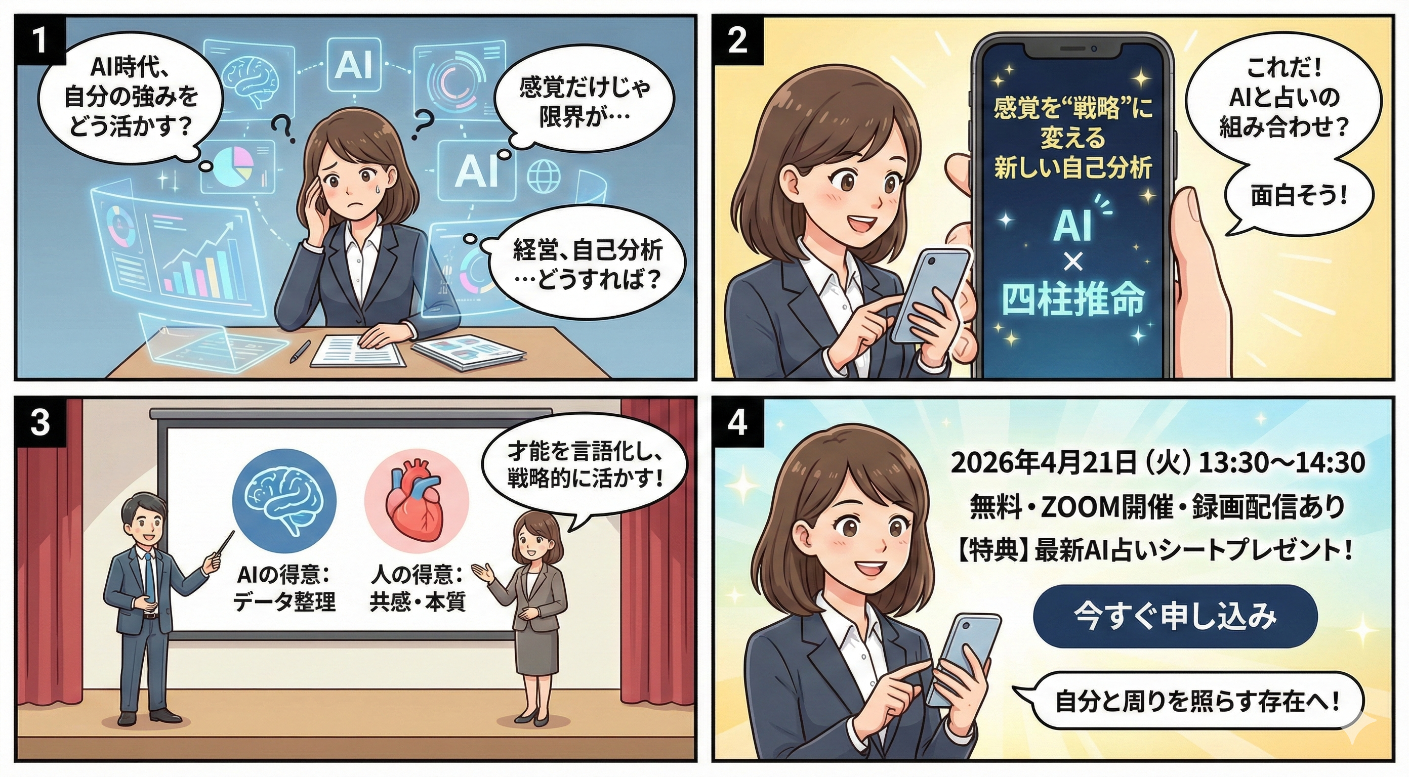 AI時代に自分の強みをどう活かすかを学ぶ60分。AIと四柱推命を組み合わせ、才能や役割をわかりやすく言葉にする方法を解説します。AIにできることと人にしかできないことの違いを知り、感覚だけでなく戦略として自分を活かすヒントが得られるセミナーです。