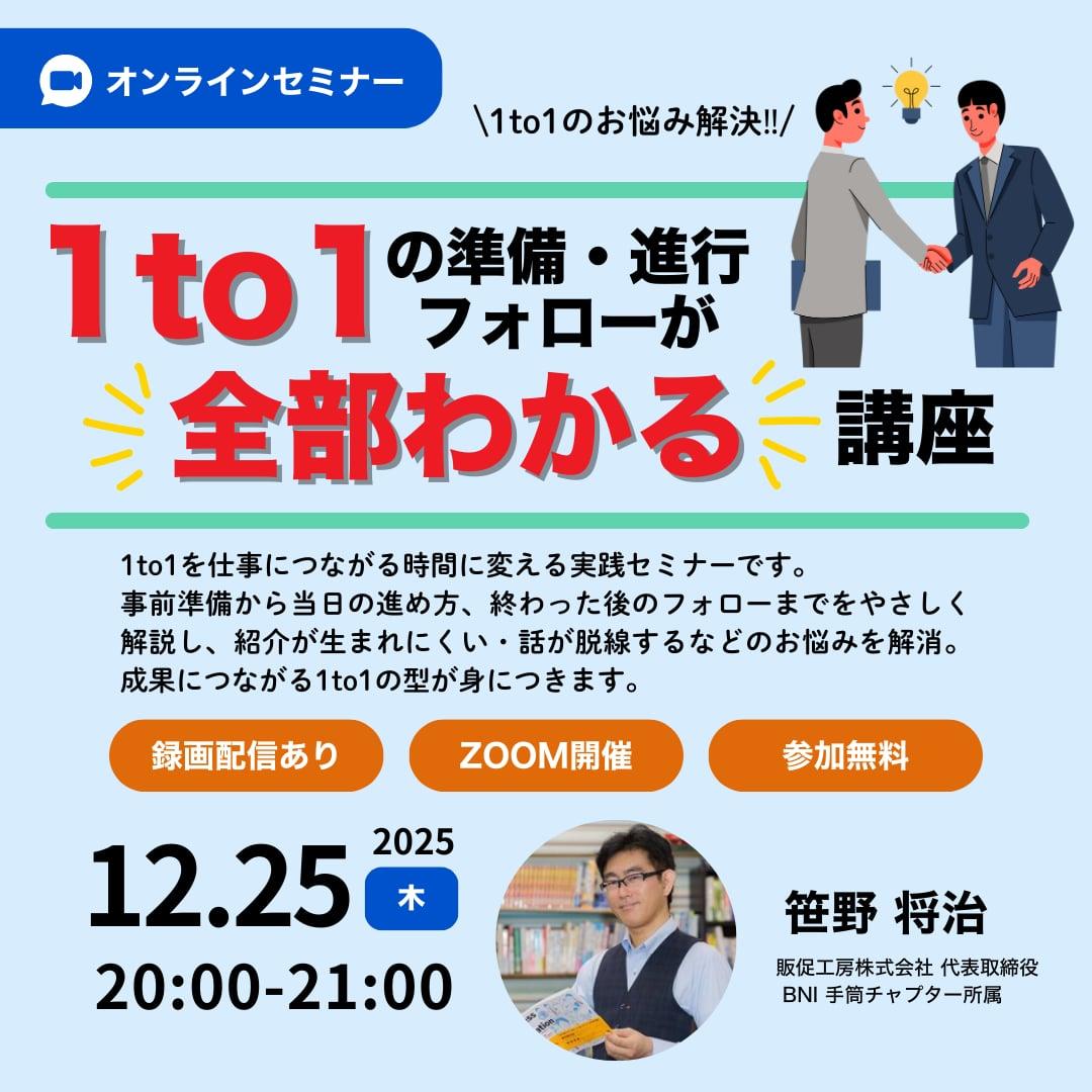 「1to1の準備・進行・フォローが全部わかる講座」は、1to1がもっとスムーズに、そして“仕事につながる時間”になるように作られた実践型セミナーです。事前準備で何を見ればいいのか、当日にどんな進め方をすれば相手の強みを引き出せるのか、終わった後にどうフォローすれば次の紹介につながるのかまで、やさしく分かりやすく解説します。話が脱線してしまう、紹介がなかなか生まれない、質問に迷ってしまう…そんなお悩みをスッキリ解消。1時間で、成果に直結する“本当に使える1to1の型”を身につけられます。