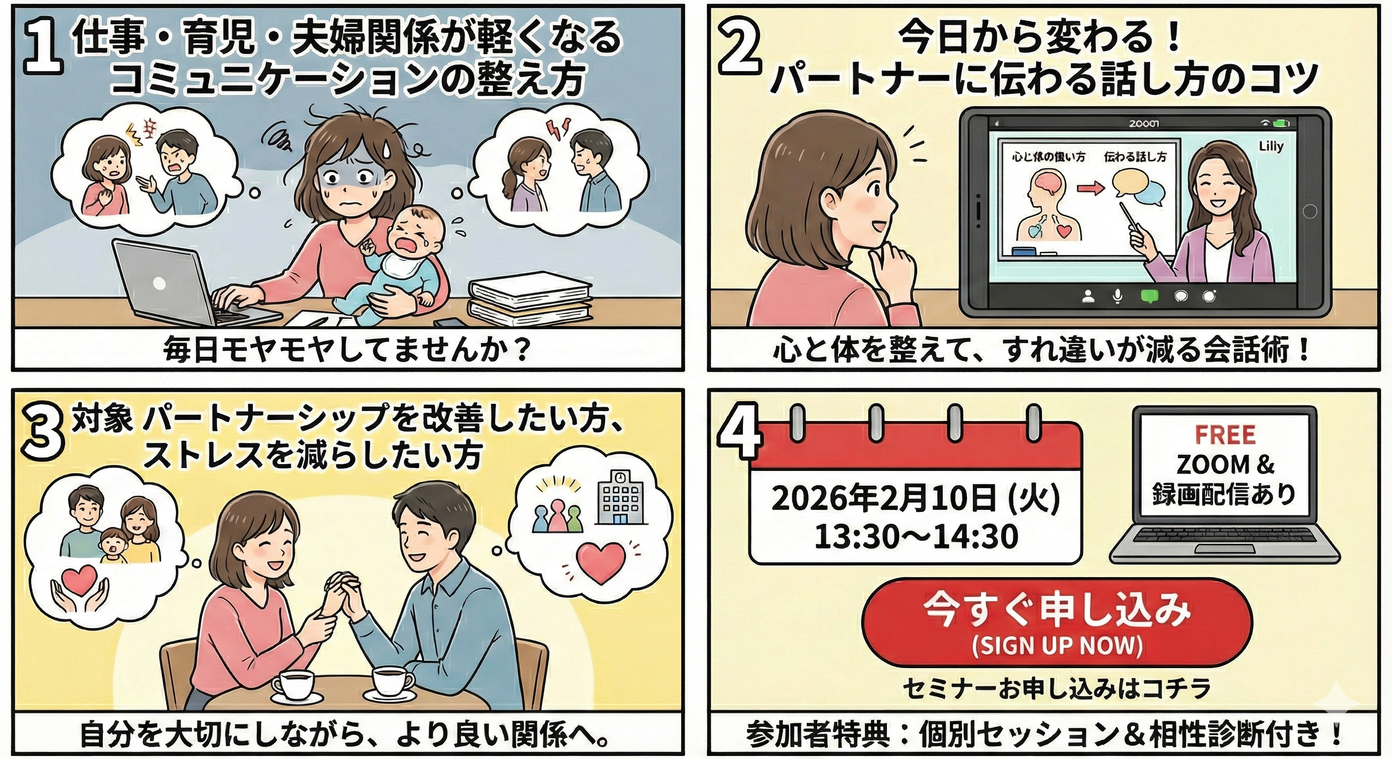 タイトル:仕事・育児・夫婦関係が軽くなるコミュニケーションの整え方