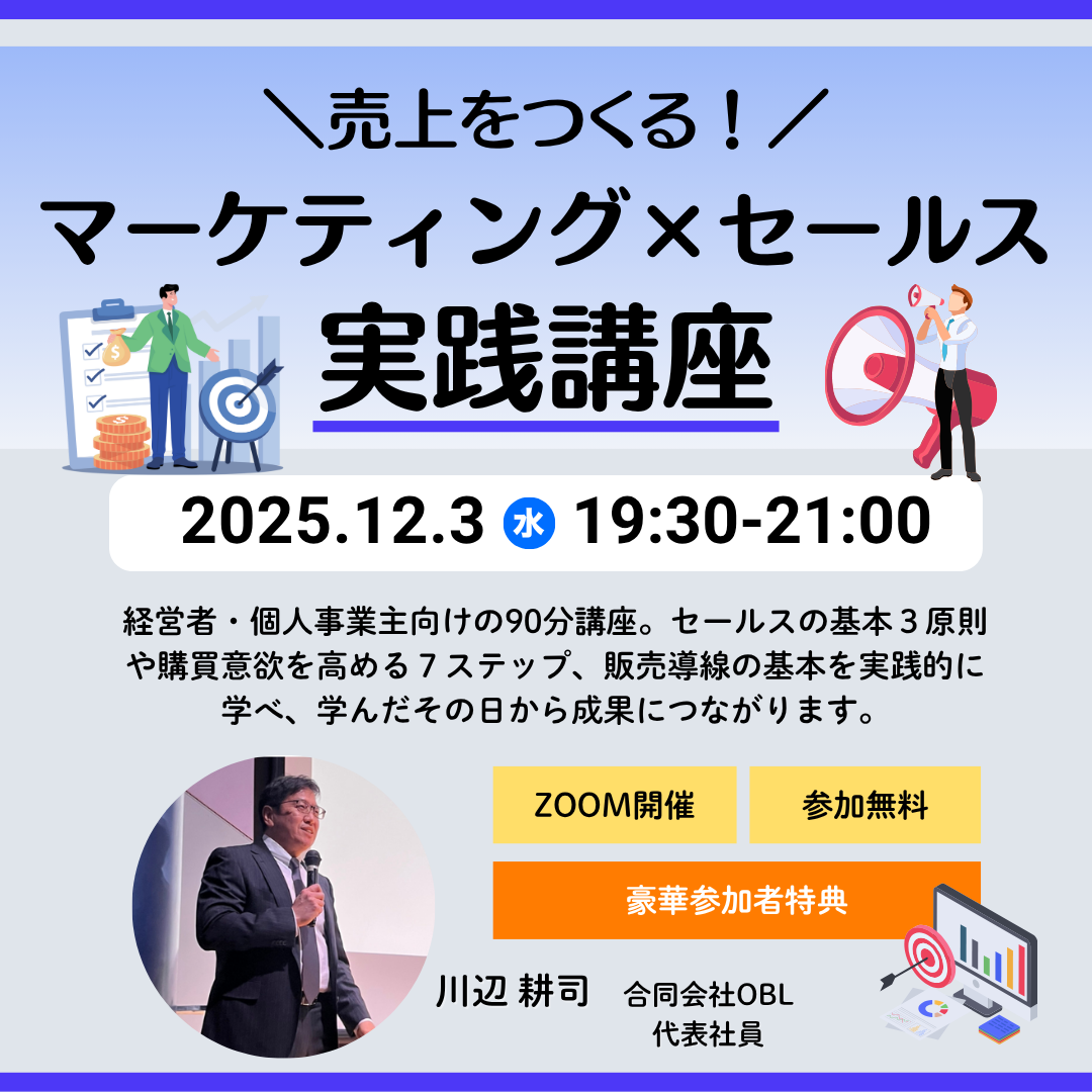 「売上をつくる!マーケティング×セールス実践講座」は、経営者や個人事業主の方がすぐに実践できる販売ノウハウを学べる90分のセミナーです。知られていないセールスの基本3原則から、お客さまの購買意欲を高める7つのステップ、オンラインでも店舗でも使える販売導線の作り方までを具体的に解説。講師自身が豊富な実績の中で磨き上げてきた知識を、わかりやすく実践的にお伝えします。学んだその日から売上につながる行動ができる、成果直結型の講座です。