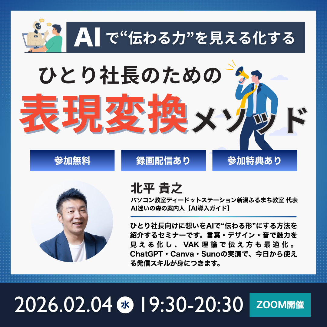 AIで“伝わる力”を見える化する表現変換メソッドは、ひとり社長向けに想いをAIで“伝わる形”にする方法を紹介するセミナーです。言葉・デザイン・音で魅力を見える化し、VAK理論で伝え方も最適化。ChatGPT・Canva・Sunoの実演で、今日から使える発信スキルが身につきます。
